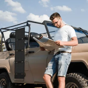 With its folding four-panel structure, the portable solar panel significantly reduces in size when folded, allowing it to easily fit into compact spaces such as backpacks, SUVs, or minivans.